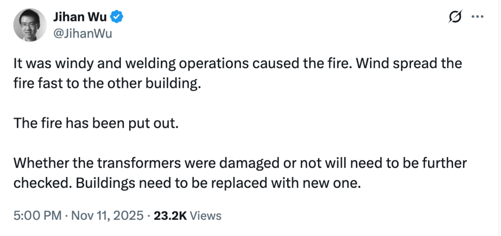 In a post on X, Bitdeer Chairman Jihan Wu said the fire started during welding operations and spread rapidly due to strong winds. He said the company’s senior management team was on site to investigate and assess the extent of the damage.