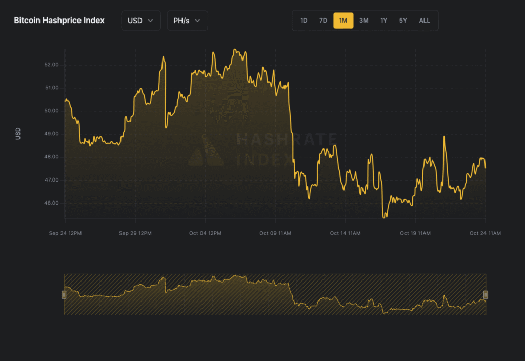 Bitcoin’s price slide from recent highs has left miners navigating shrinking margins. Hashprice hovers near $47 per petahash per day, while Luxor’s Hashrate Index reported a -2.7% difficulty adjustment, giving only brief relief.