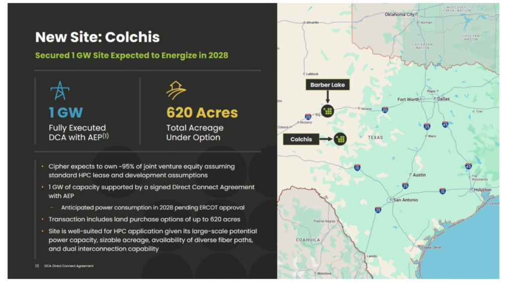 Cipher also formed a joint venture in West Texas to develop a new 1-gigawatt site called “Colchis.” Cipher will finance most of the project and expects to retain 95% ownership. The site features a 1-gigawatt Direct Connect Agreement with American Electric Power to construct a dual interconnection facility, scheduled for energization in 2028. The 620-acre site is next to an existing substation and intended for high-performance computing data center use.