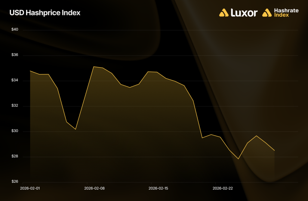 Per Luxor’s report, the month’s most significant development was hashprice reaching an all-time low of $27.89/PH/day on February 24.