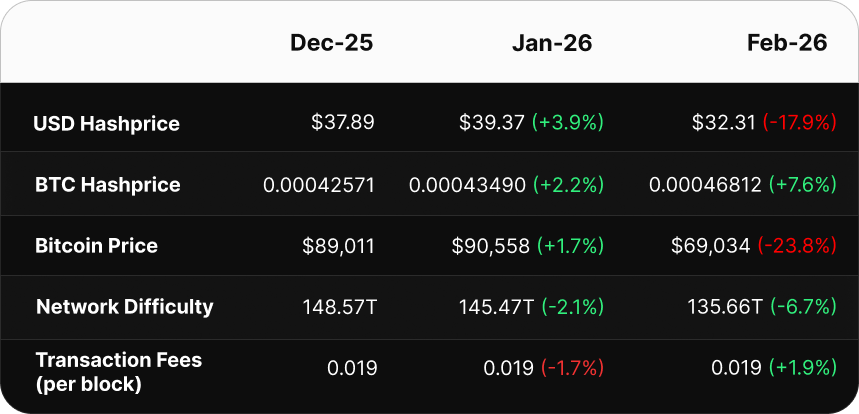 Bitcoin’s steep drop in price was the primary driver compressing hashprice in February. Bitcoin opened the month at $78,073 and spent the next four weeks sliding to a close of $65,204, representing a 23.8% monthly decline and a monthly average of roughly $69,000. The nadir of this selloff was $63,000, marking a 50% drawdown from bitcoin’s October 2025 all-time high.