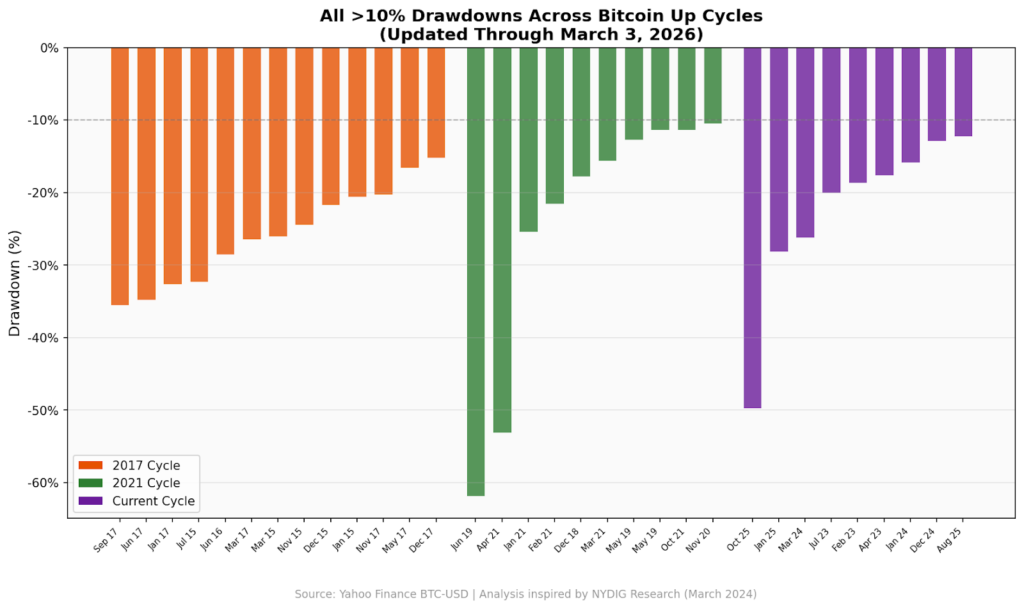 While painful, the research notes that corrections of this magnitude are a recurring feature of bitcoin bull cycles, not an anomaly.