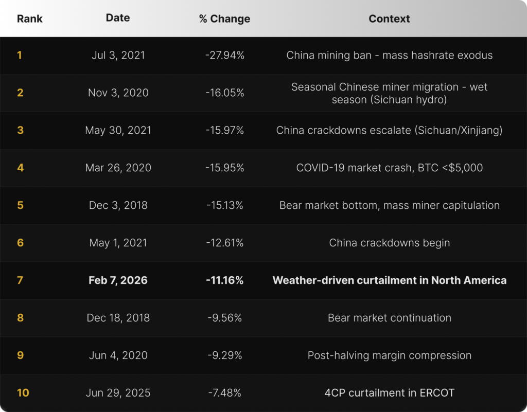 The resulting shortage of active hashrate produced a downward difficulty adjustment of 11.16% on February 7th — the seventh-largest negative adjustment in the modern ASIC era (defined in the report as 2016 onward) and the largest single-epoch drop since the July 2021 China ban.