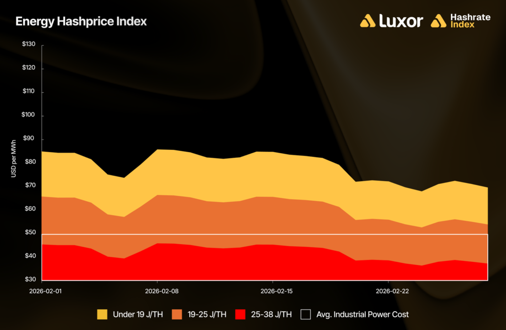 With hashprice squeezed from both ends by bearish price action and a rising difficulty, older generation ASIC hardware is treading water. Implied mining revenue per unit of electricity consumed was approximately $79 per MWh for the most efficient fleets (those with energy efficiency under 19 J/TH), dropping to $61 per MWh for mid-tier operations (19–25 J/TH) and $42 per MWh for older machines in the 25–38 J/TH range.
