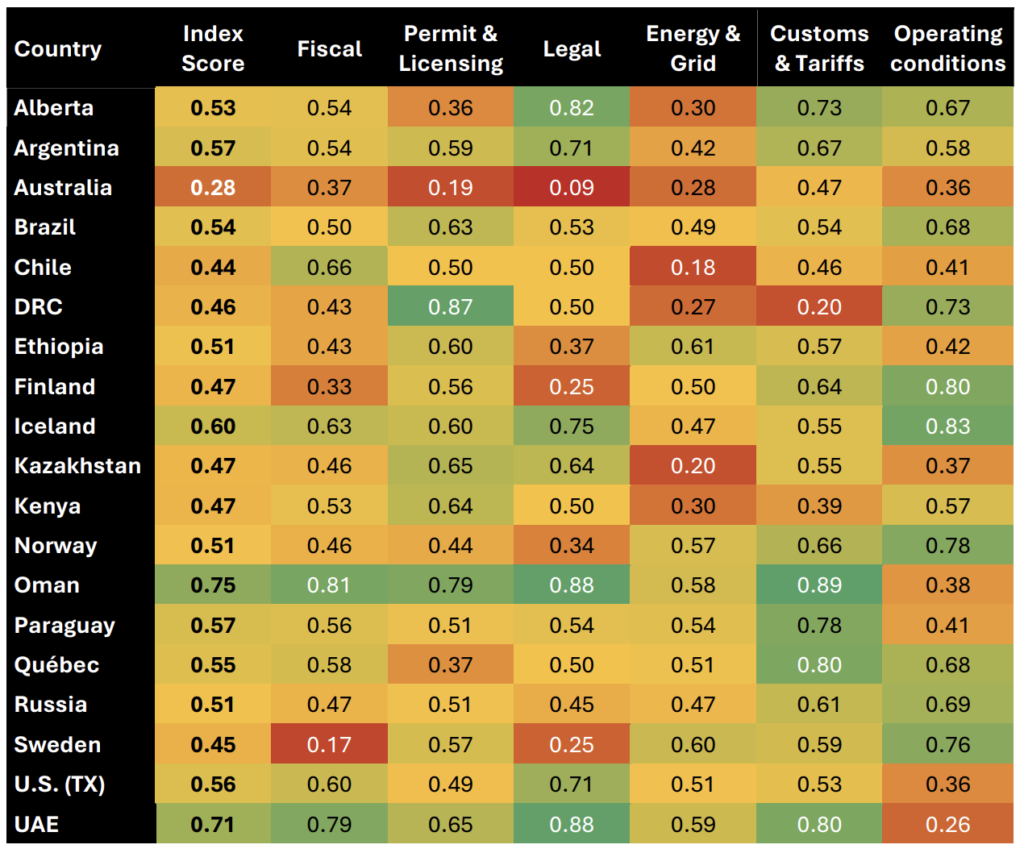 The index is based on a survey of 48 industry participants across 18 jurisdictions. Each country’s score reflects the relative ease of operating mining infrastructure according to several core factors, including legal and fiscal frameworks, permitting and licensing requirements, energy market structure and grid access, and tariffs and customs procedures. The index also factors in climate-related operating conditions based on internal analysis.